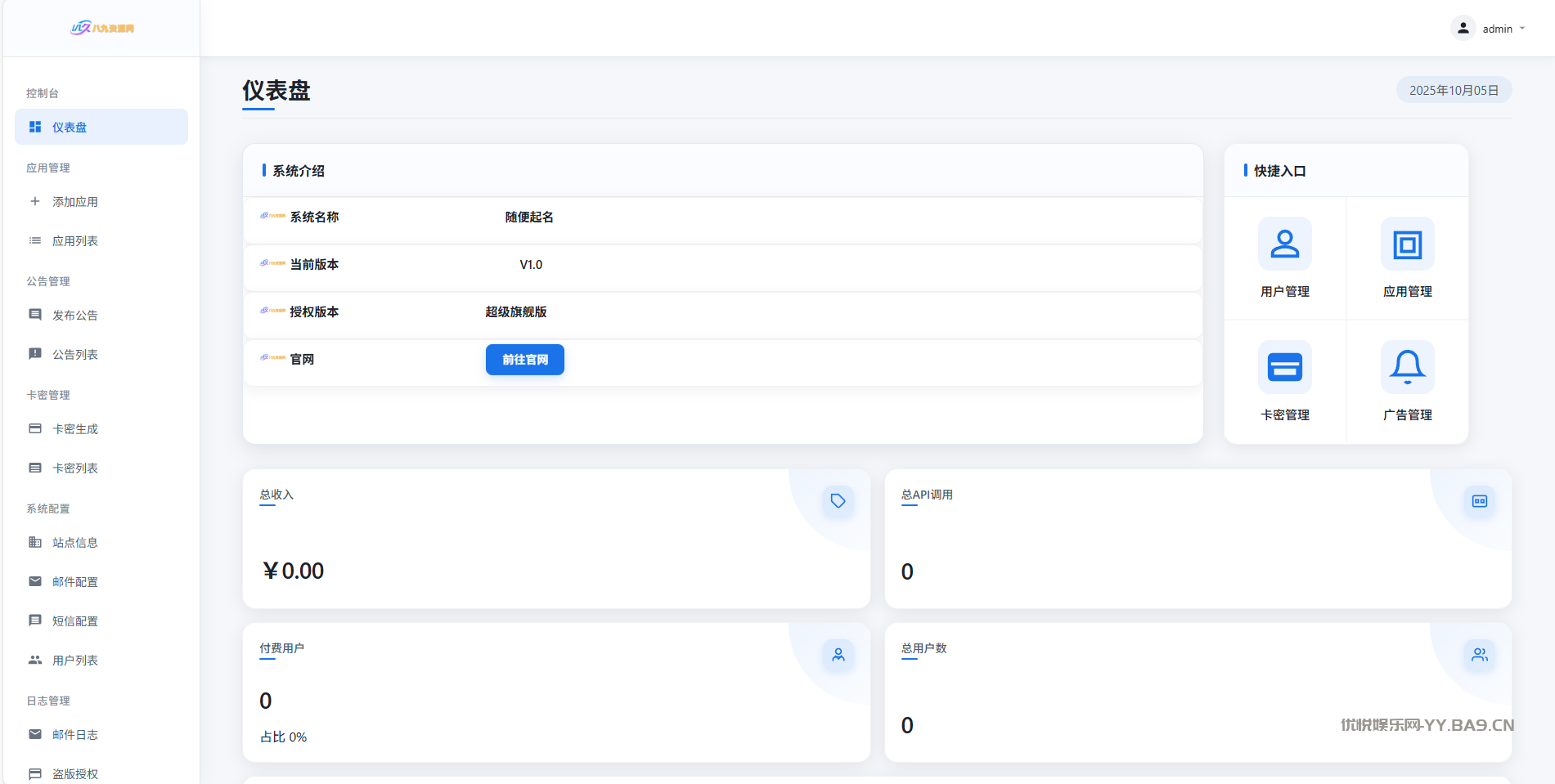 最近网上发现的一款多应用授权系统,看到是开源版就给大家搬过来了,已经搭建测试过了,有一些BUG,不是什么大问题,有需要的朋友可以下载安装,自行修复一下,时间关系就不给大家修复