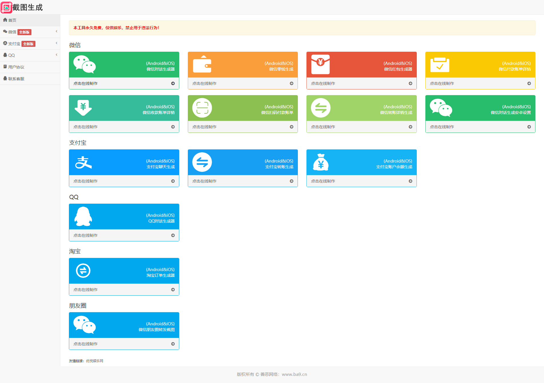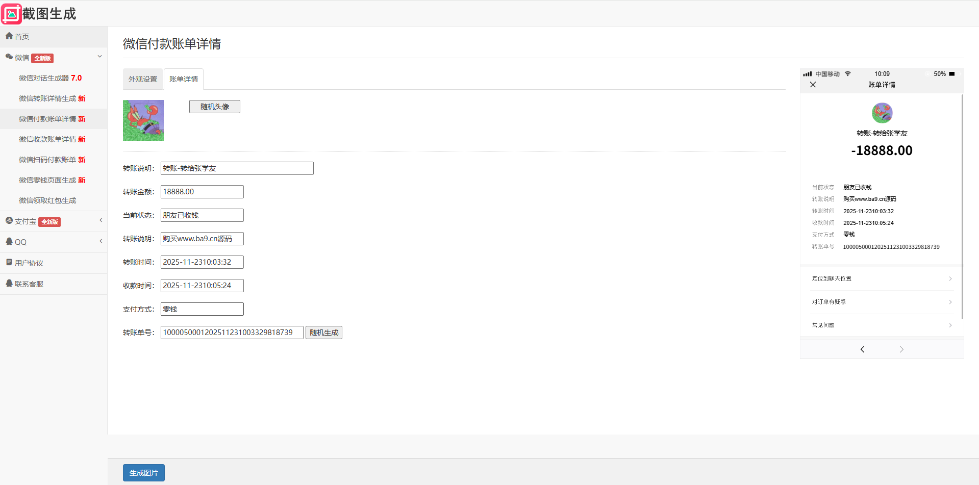 包含生成功能:微信对话、微信领取红包、微信付款详情、微信收款详情、微信转账详情、微信零钱页面详情、微信扫码付款账单、微信对话和红包带安卓设置、微信朋友圈转发详情、支付宝聊天详情、支付宝转账详情、支付宝账户余额详情、淘宝订单详情、QQ聊天详情、手机短信聊天详情!