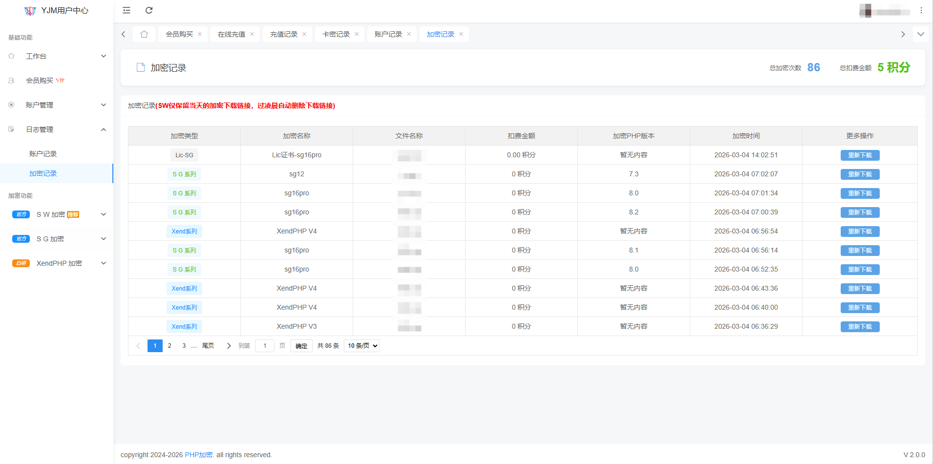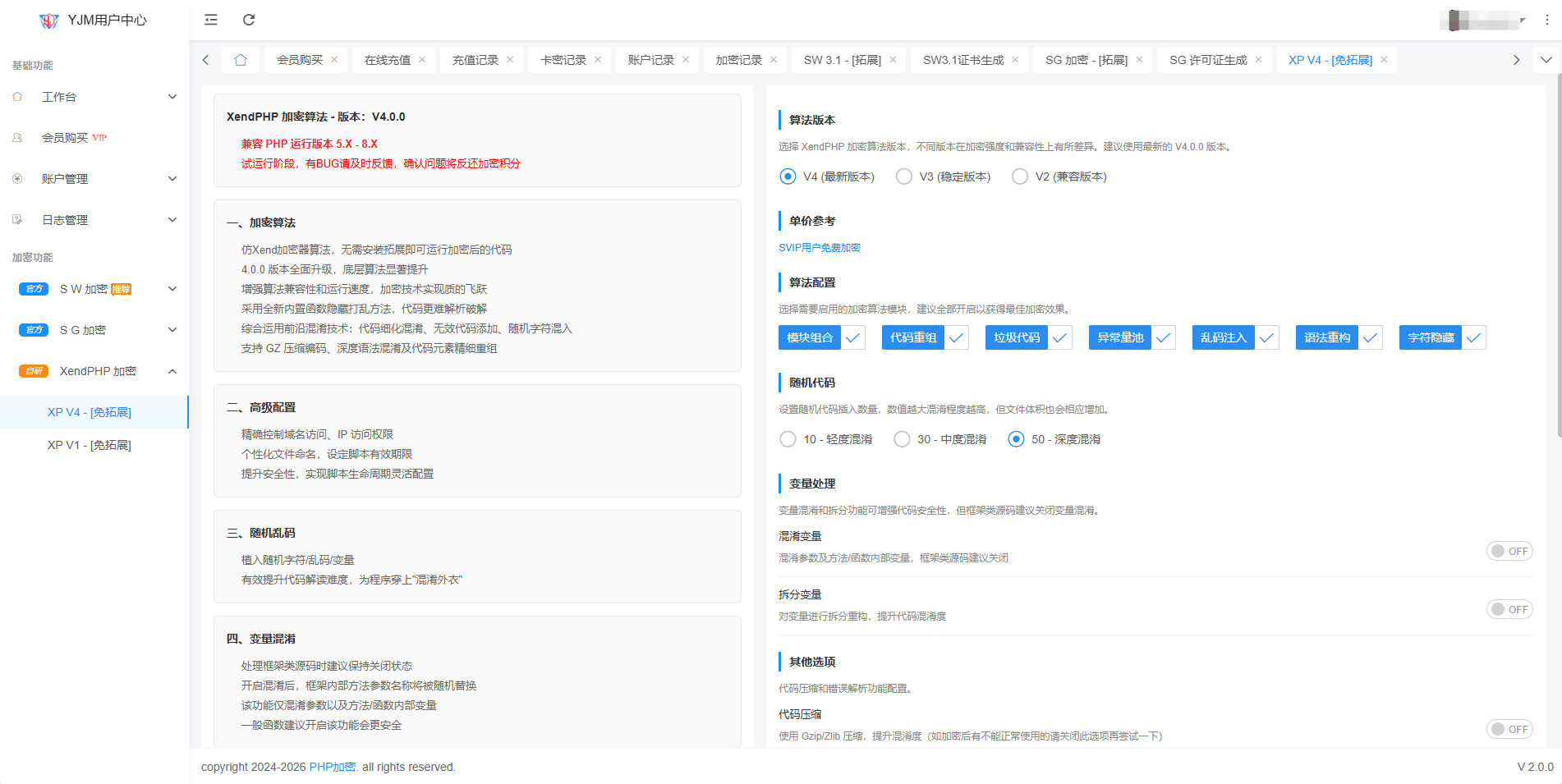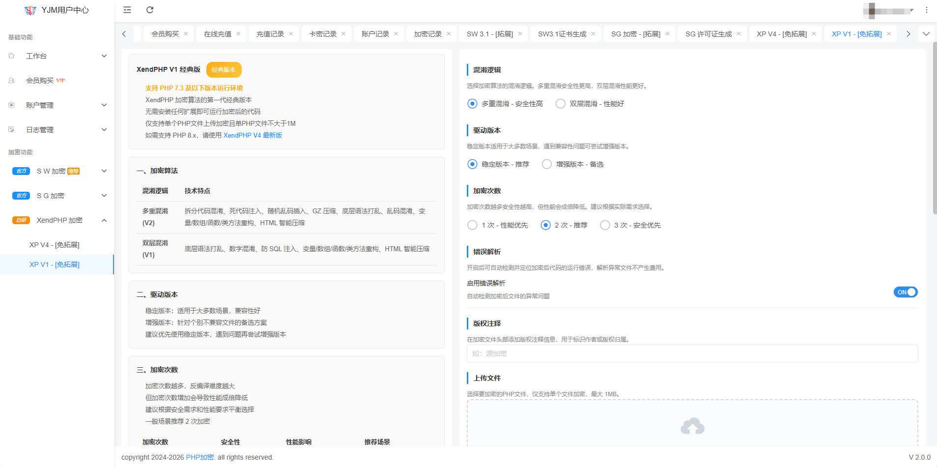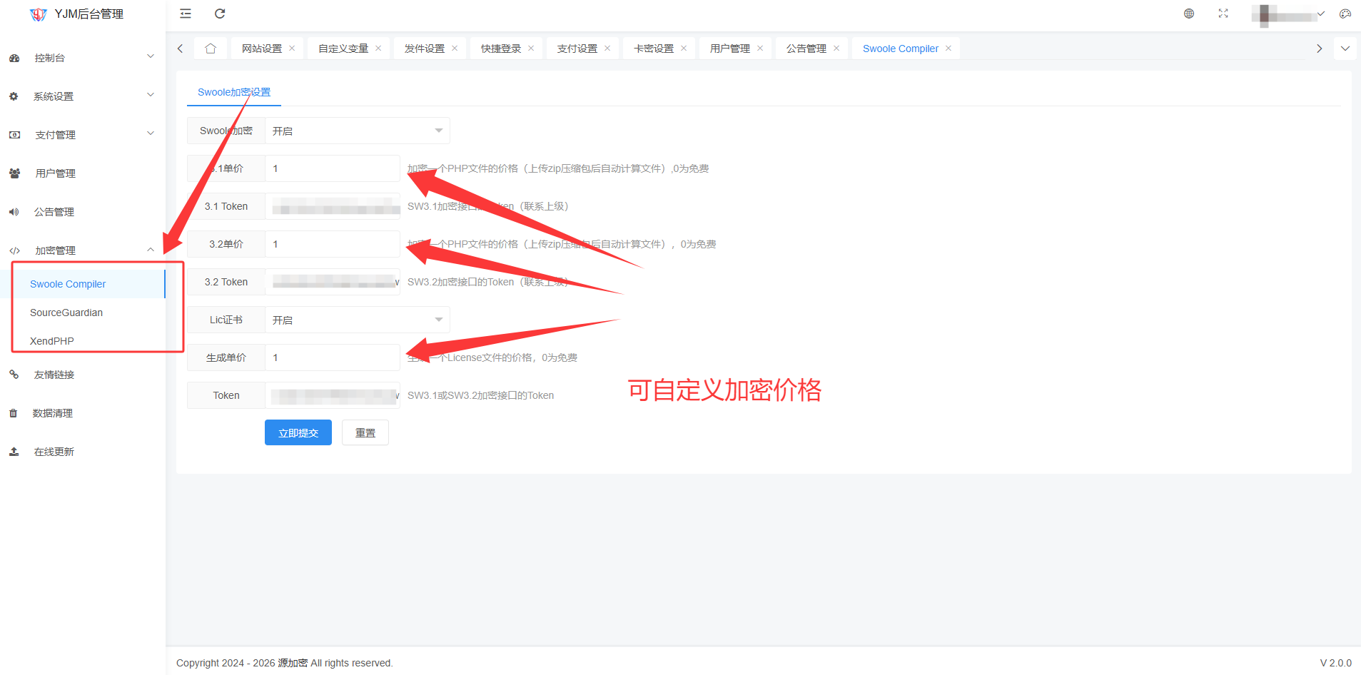自研开发系统采用Thinkphp8.1.2 + layui 开发:源加密系统,PHP代码在线加密平台,集成了SW3.1、SW3.2、SG11~SG16 Pro、XendPHP V1~V4,目前程序采用单域名授权机制,系统授权699,系统可永久使用,除了SW加密器后续需要单独付费外,其他加密功能都是免费的,699购买加密系统后,会赠送一年的SW加密,到期后可续费,SW续费价格400一年,介意的到时候可以关闭SW加密,供用户使用其他加密(注:购买本系统的除了SW需要后期续费外,其他加密全部免费)