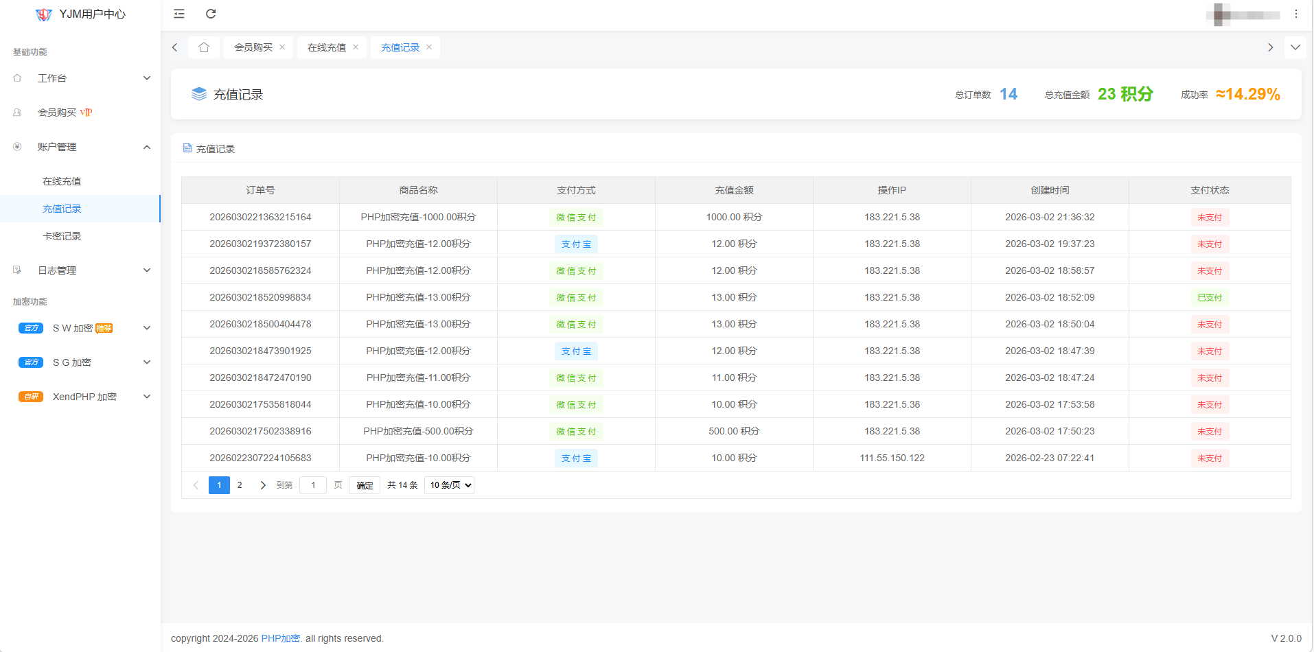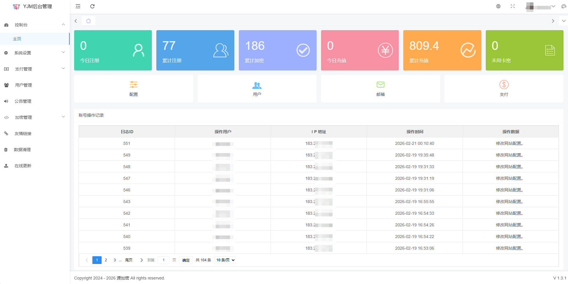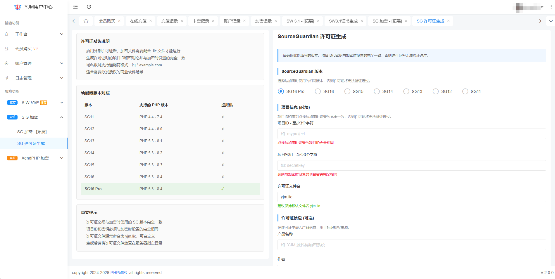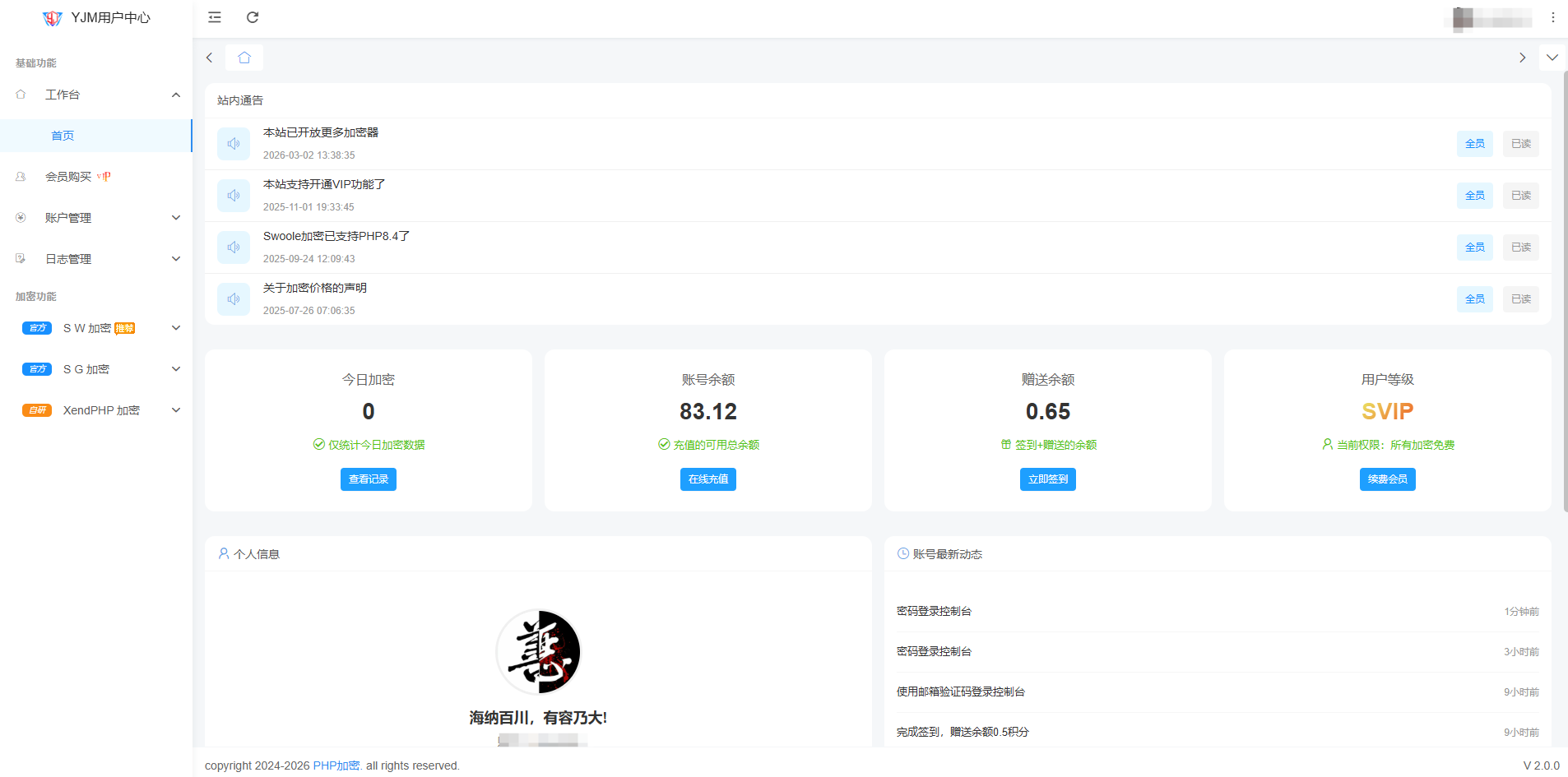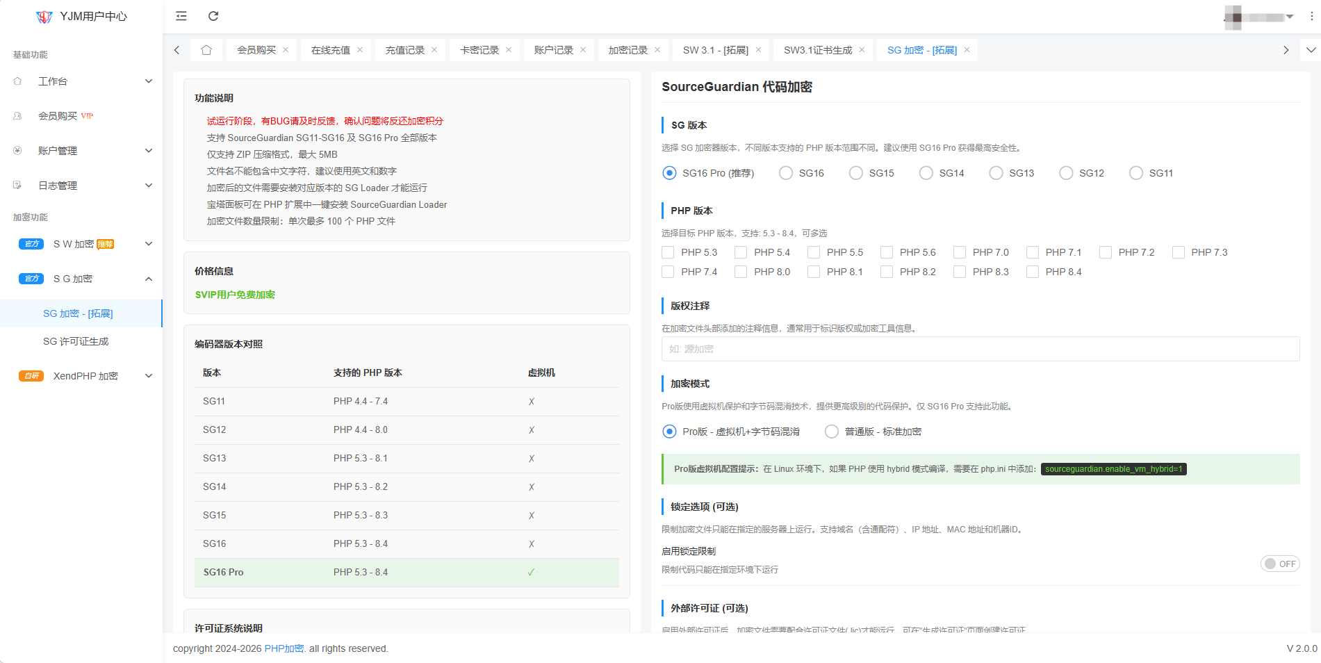 自研开发系统采用Thinkphp8.1.2 + layui 开发:源加密系统,PHP代码在线加密平台,集成了SW3.1、SW3.2、SG11~SG16 Pro、XendPHP V1~V4,目前程序采用单域名授权机制,系统授权699,系统可永久使用,除了SW加密器后续需要单独付费外,其他加密功能都是免费的,699购买加密系统后,会赠送一年的SW加密,到期后可续费,SW续费价格400一年,介意的到时候可以关闭SW加密,供用户使用其他加密(注:购买本系统的除了SW需要后期续费外,其他加密全部免费)